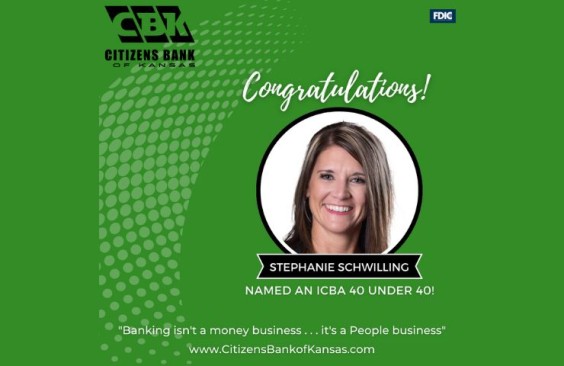 “We are delighted that the ICBA selected Stephanie Schwilling for the 40 Under 40 Community Bank Leaders award,” said Jane Deterding, Chairman of Citizens Bank of Kansas. “Stephanie is an excellent example of what it means to be a community banker. She believes in building relationships and growing communities. We applaud Stephanie’s efforts and congratulate her for this well-deserved recognition.”